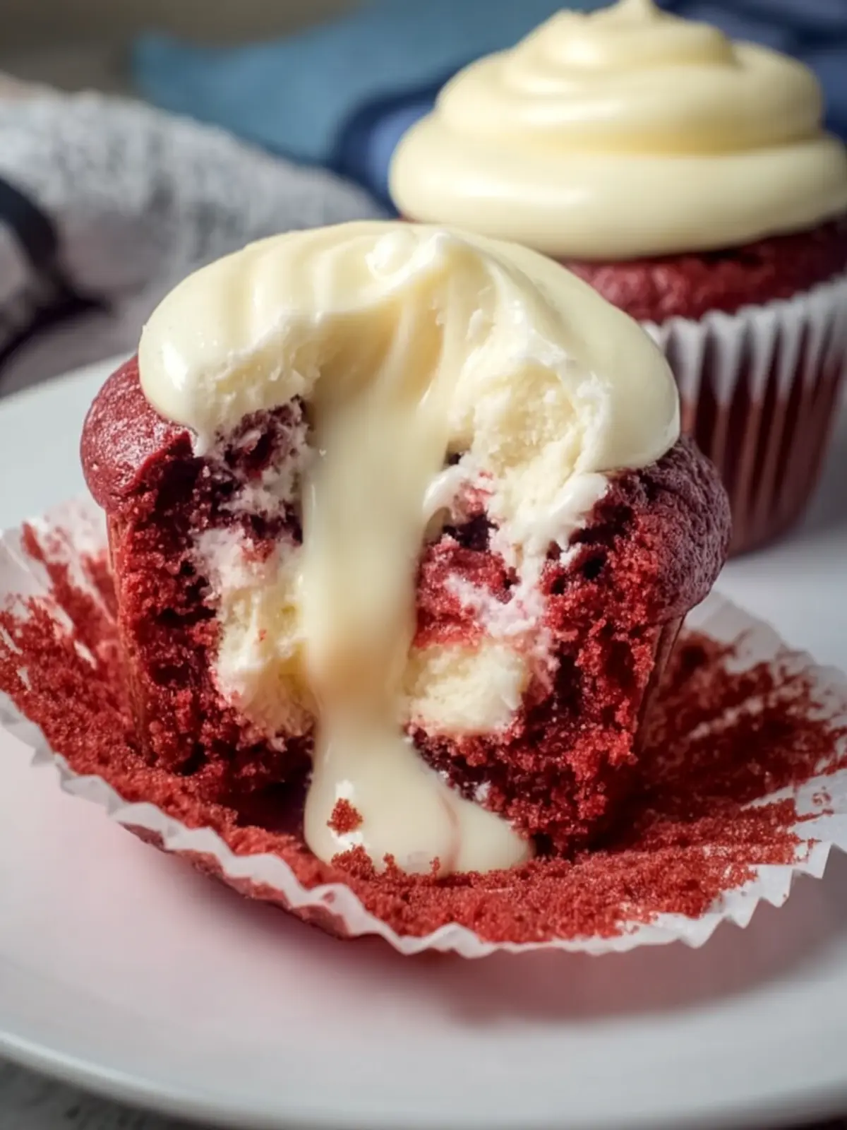 4. Assemble the Cupcakes: Fill each cupcake liner two-thirds full with red velvet batter. Add a spoonful of cream cheese filling into the center of each cupcake.
