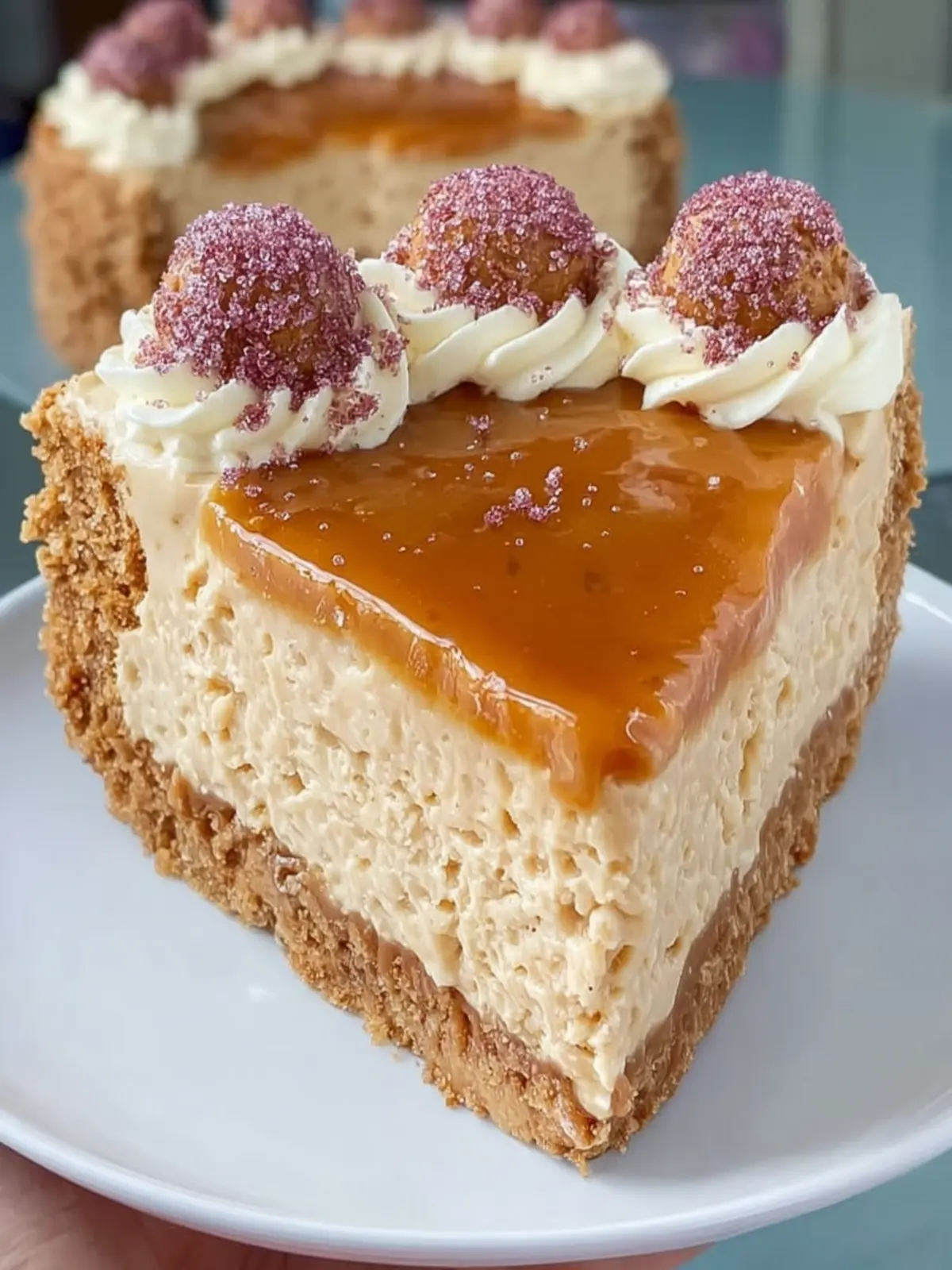 - Before serving, add chocolate shavings or a drizzle of caramel over the top for added flavor and presentation. Slice and enjoy!