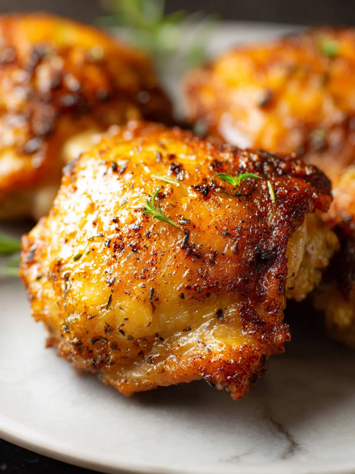 • Serve the chicken thighs on a rustic wooden board or plate, garnished with lemon wedges and sprigs of fresh herbs for a touch of elegance.