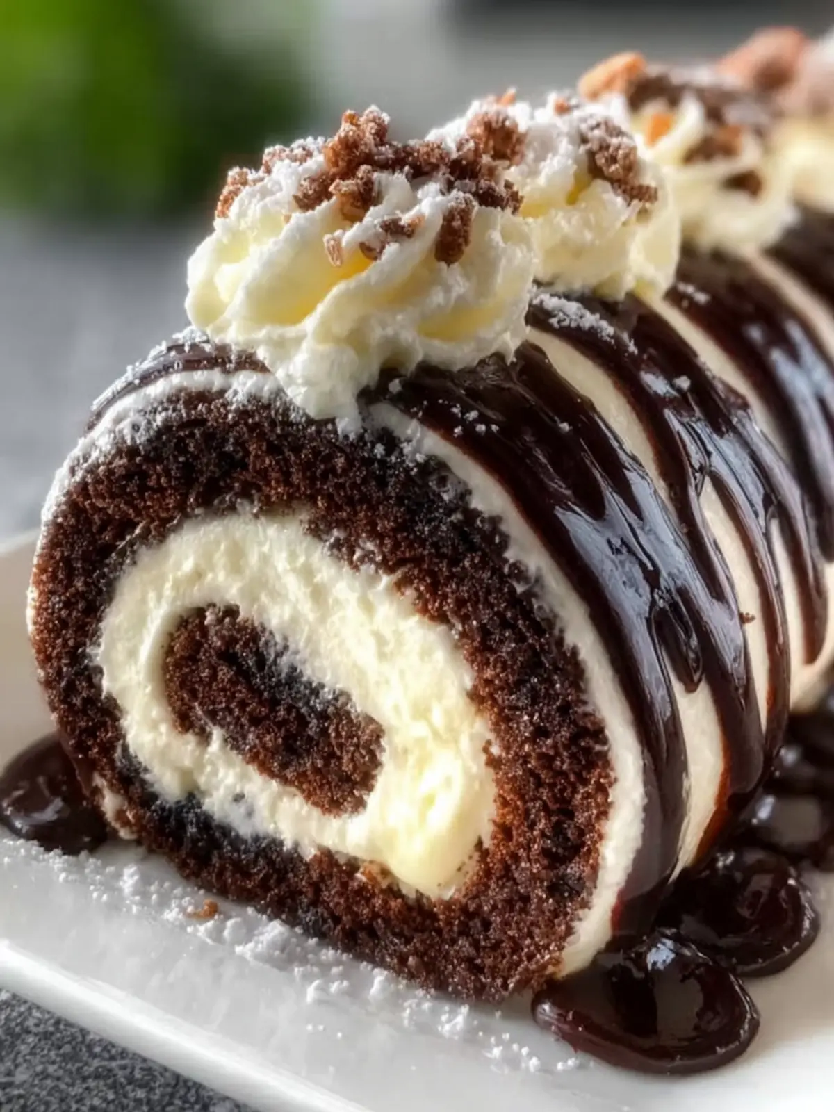 A rich and delicious chocolate Swiss roll filled with creamy whipped filling and topped with chocolate ganache.