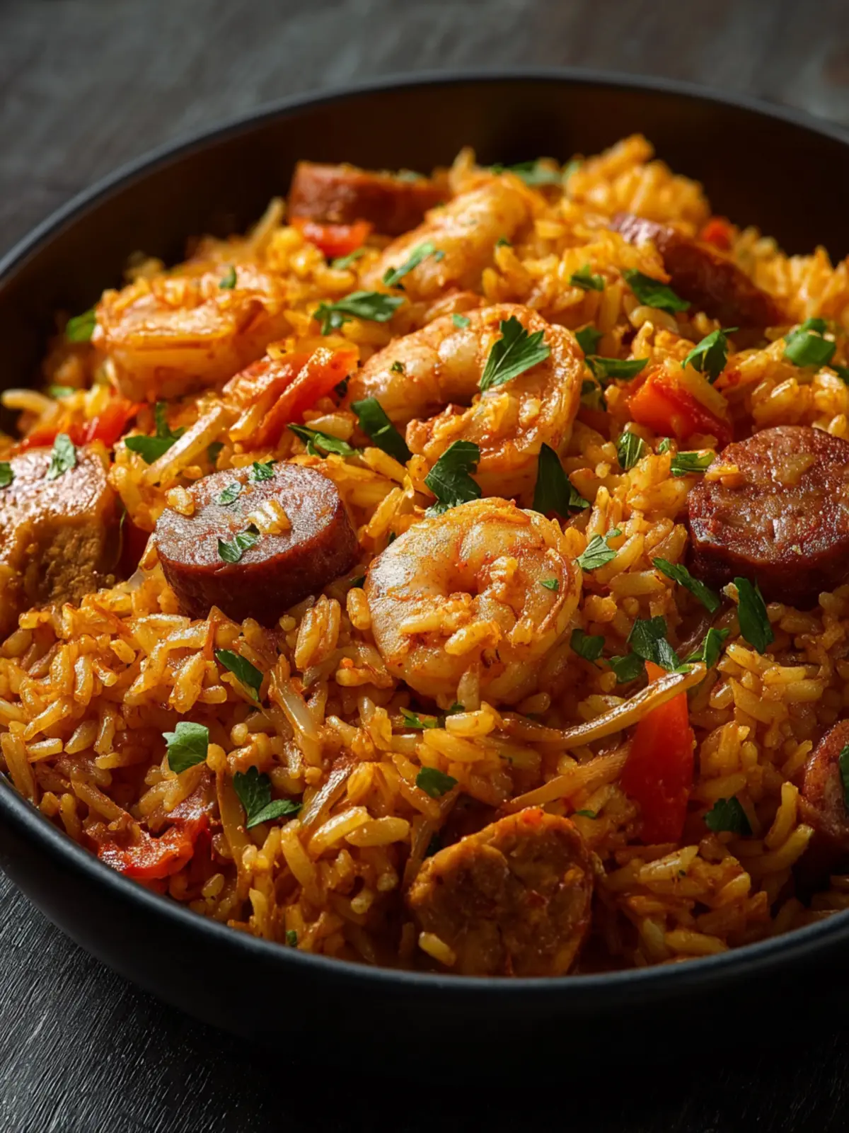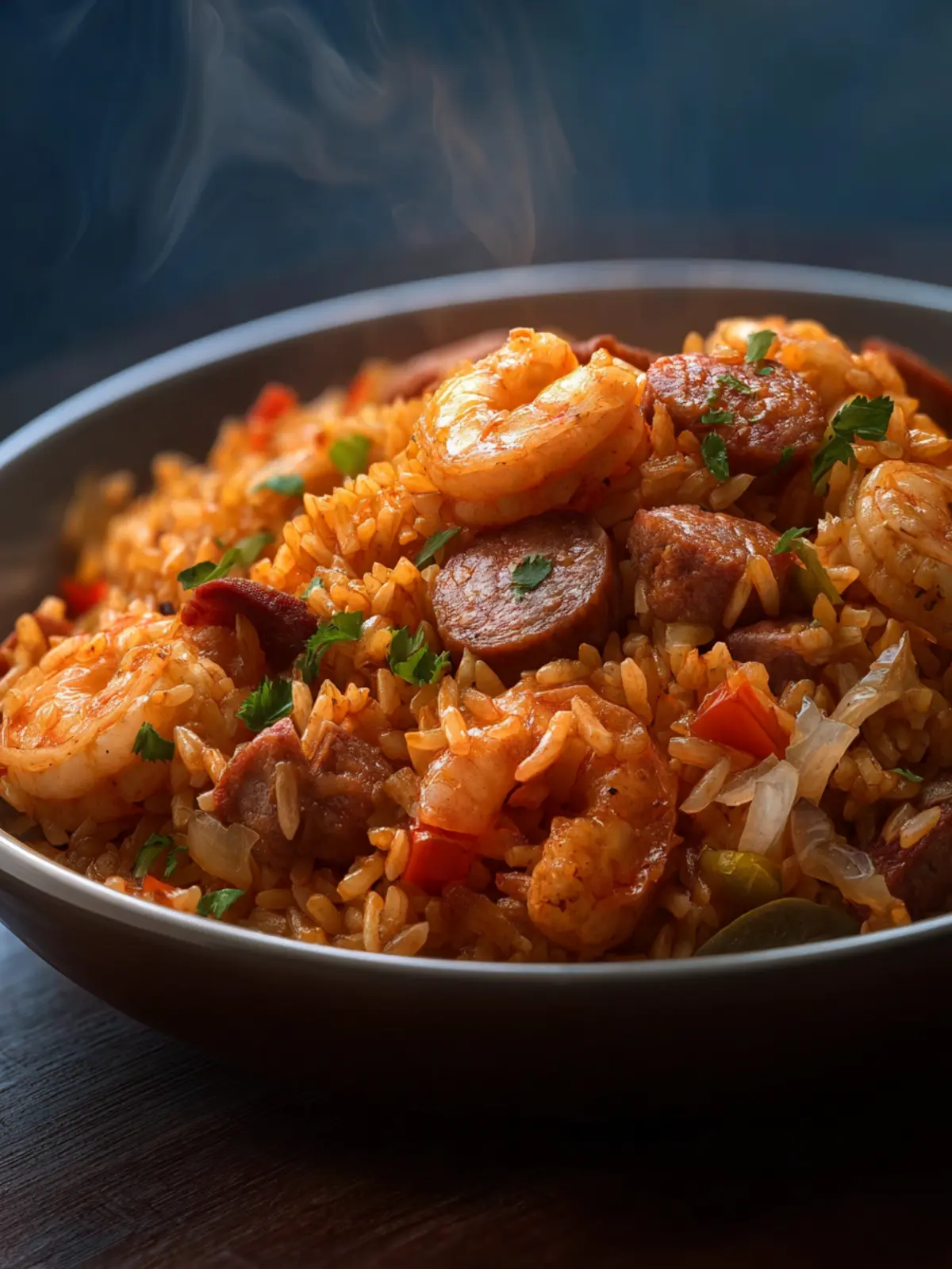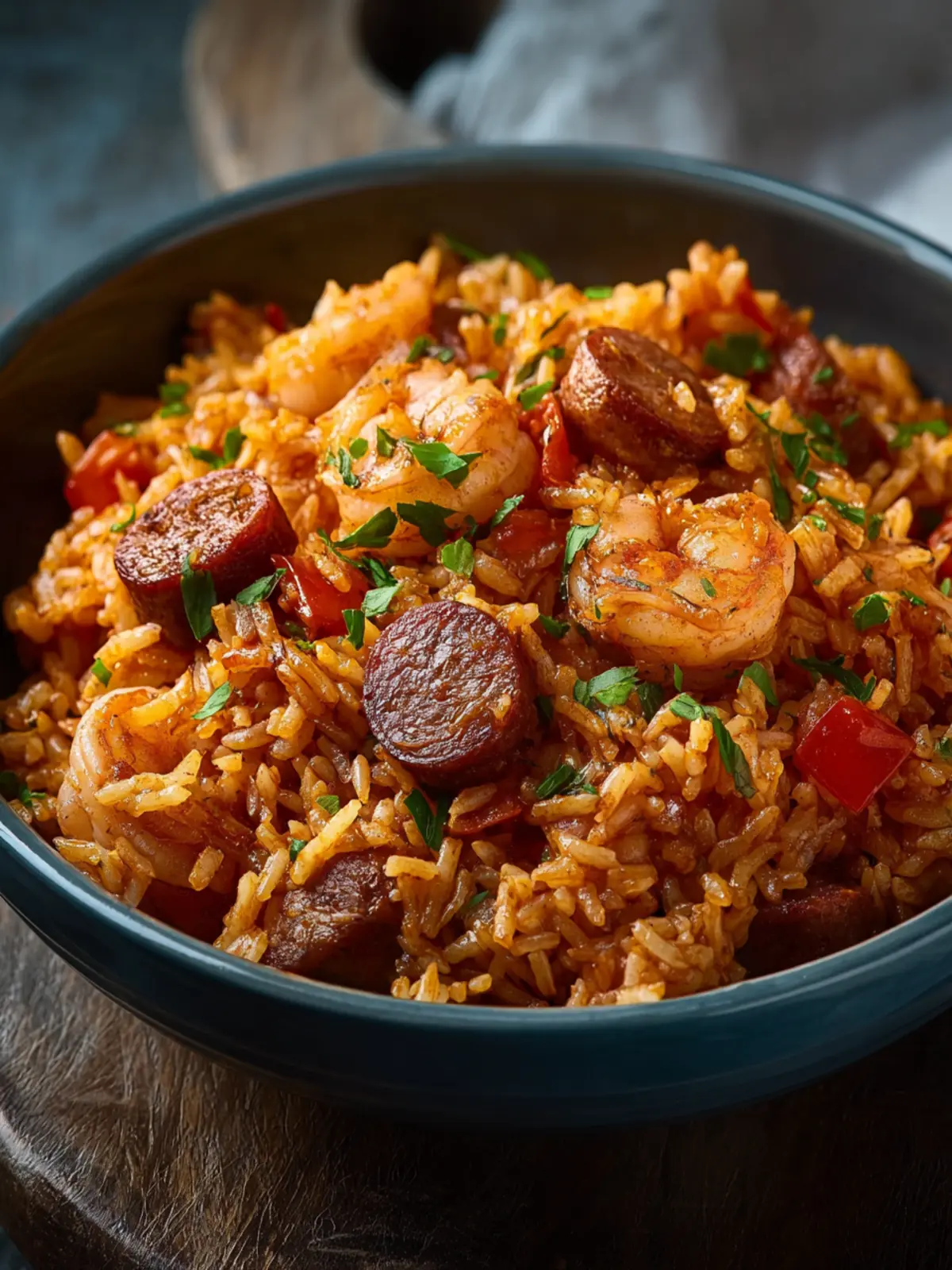 A hearty Cajun rice dish featuring andouille sausage, chicken, and prawns, seasoned to perfection.
