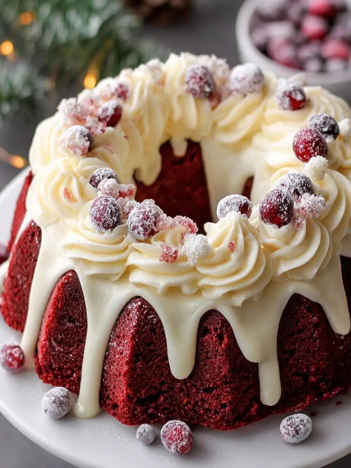 - Decorate: Once the cake is completely cool, pipe the frosting onto the cake in decorative swirls. Arrange fresh cranberries and rosemary sprigs on top of the frosting. Lightly dust with powdered sugar for a festive touch.