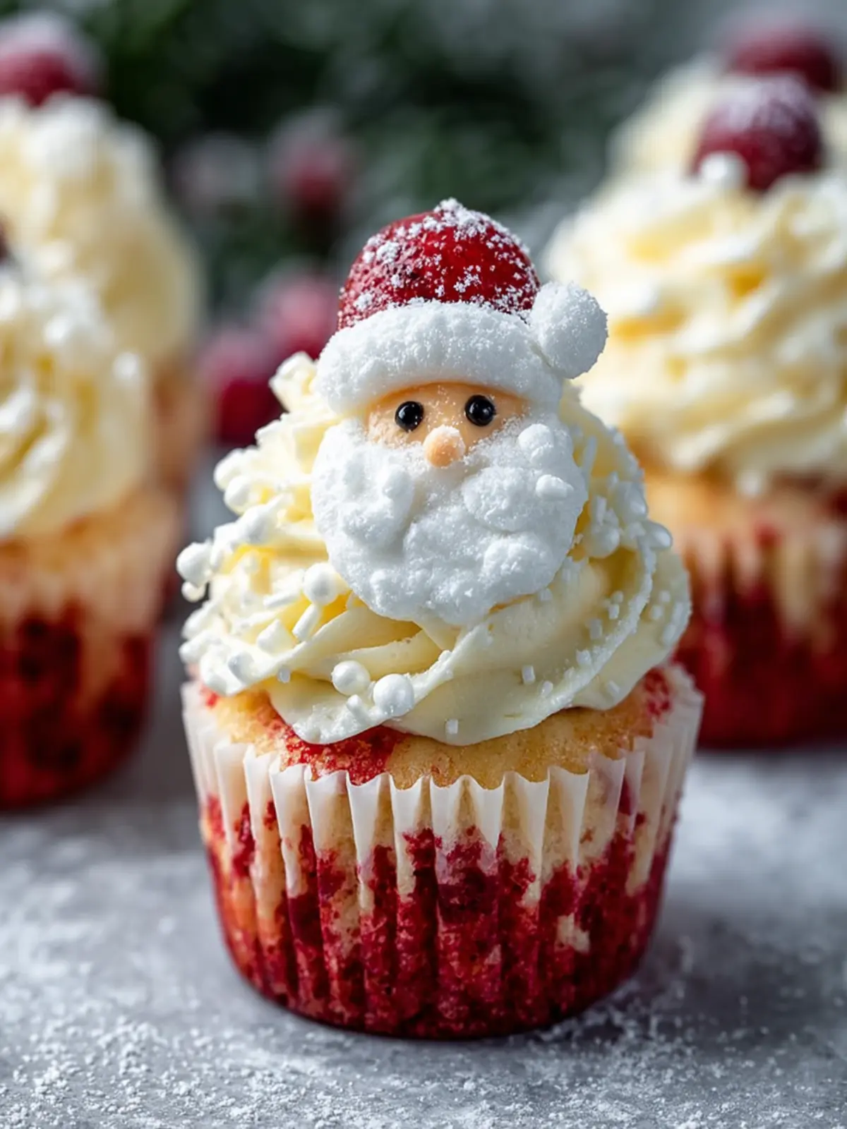 Adorable Designs: Shaped like Santa Claus, each cupcake is a mini work of art. The fluffy frosting represents Santa’s iconic hat and beard, making them an adorable centerpiece for any holiday table.