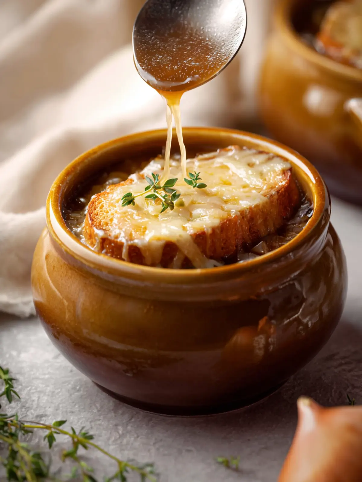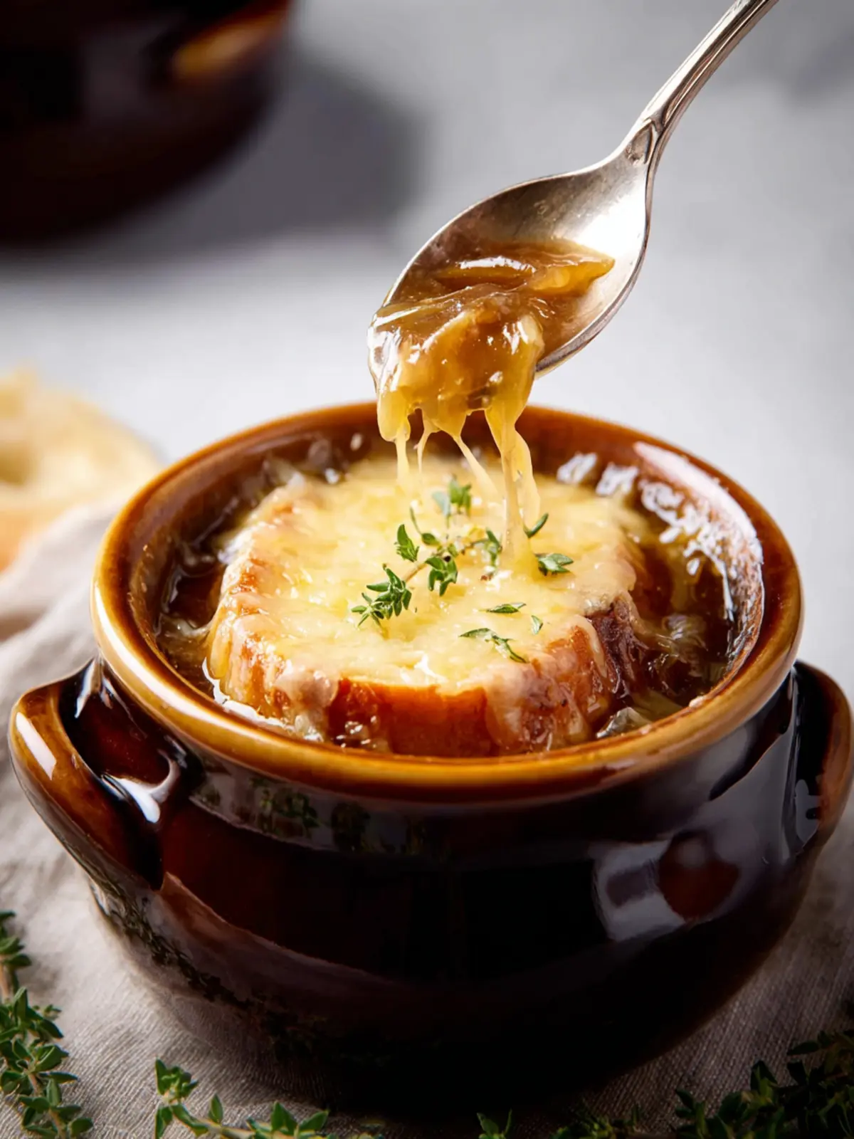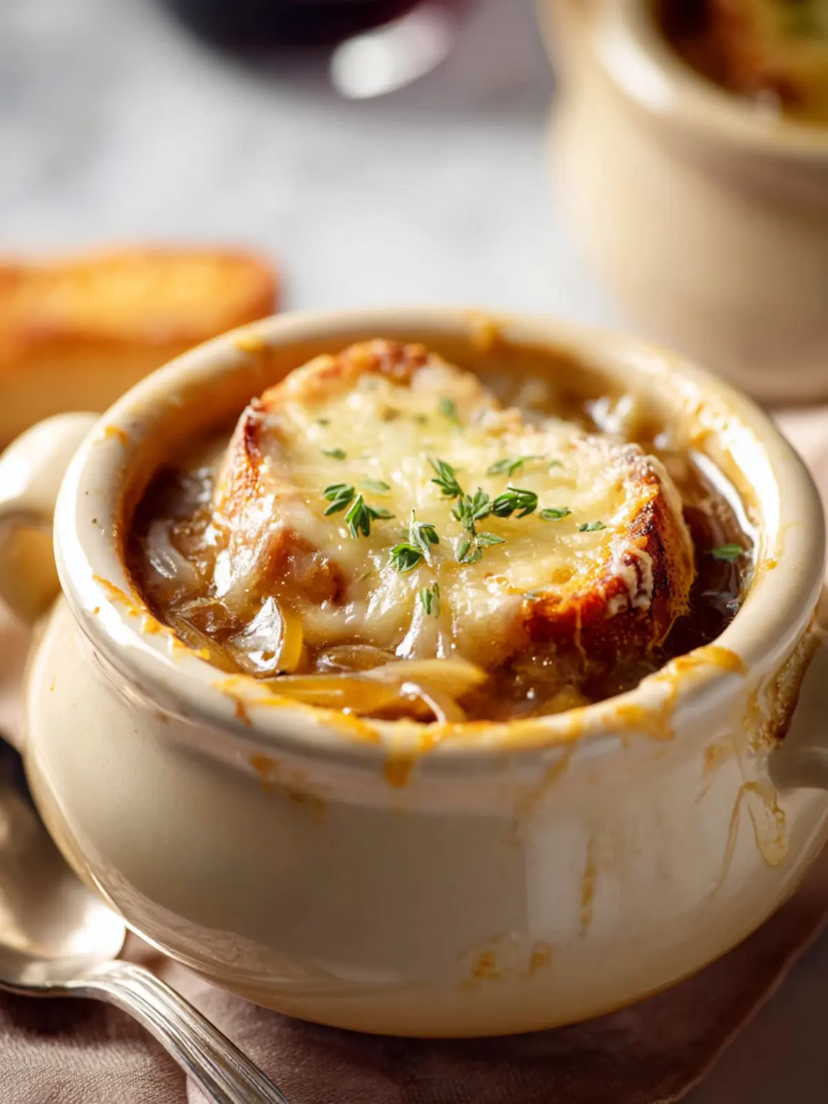 For an authentic touch, serve the soup in oven-safe bowls. A crusty baguette on the side will complete your cozy dinner for two, perfect for sharing!
