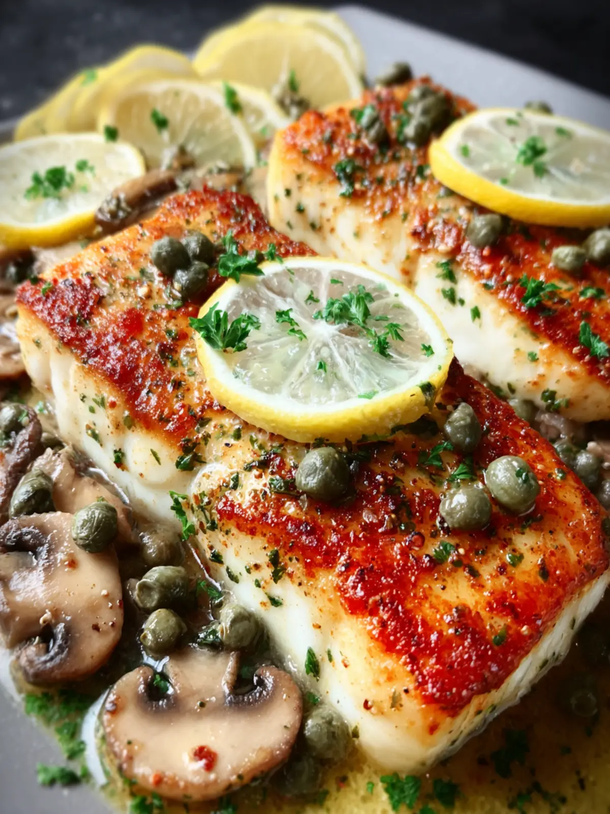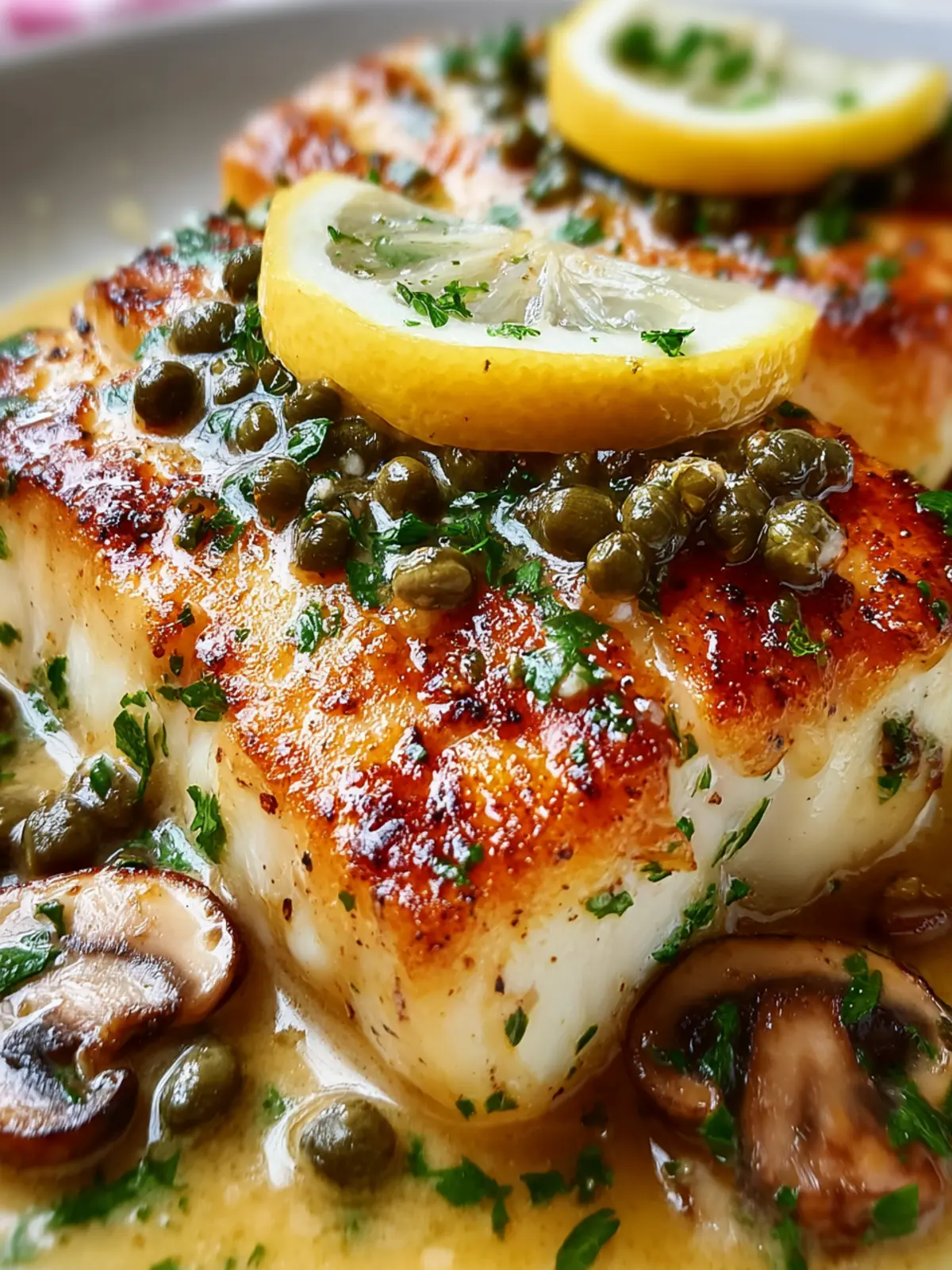Lemon Butter Halibut with Mushrooms and Capers