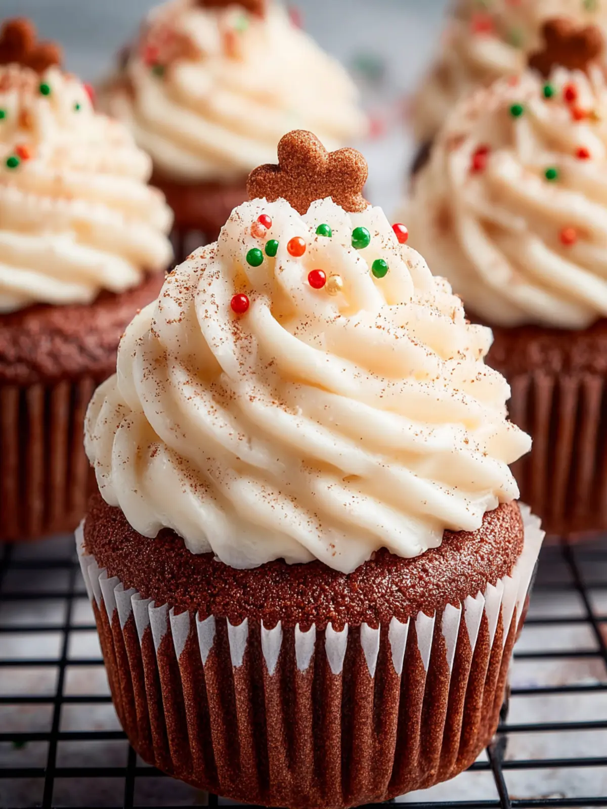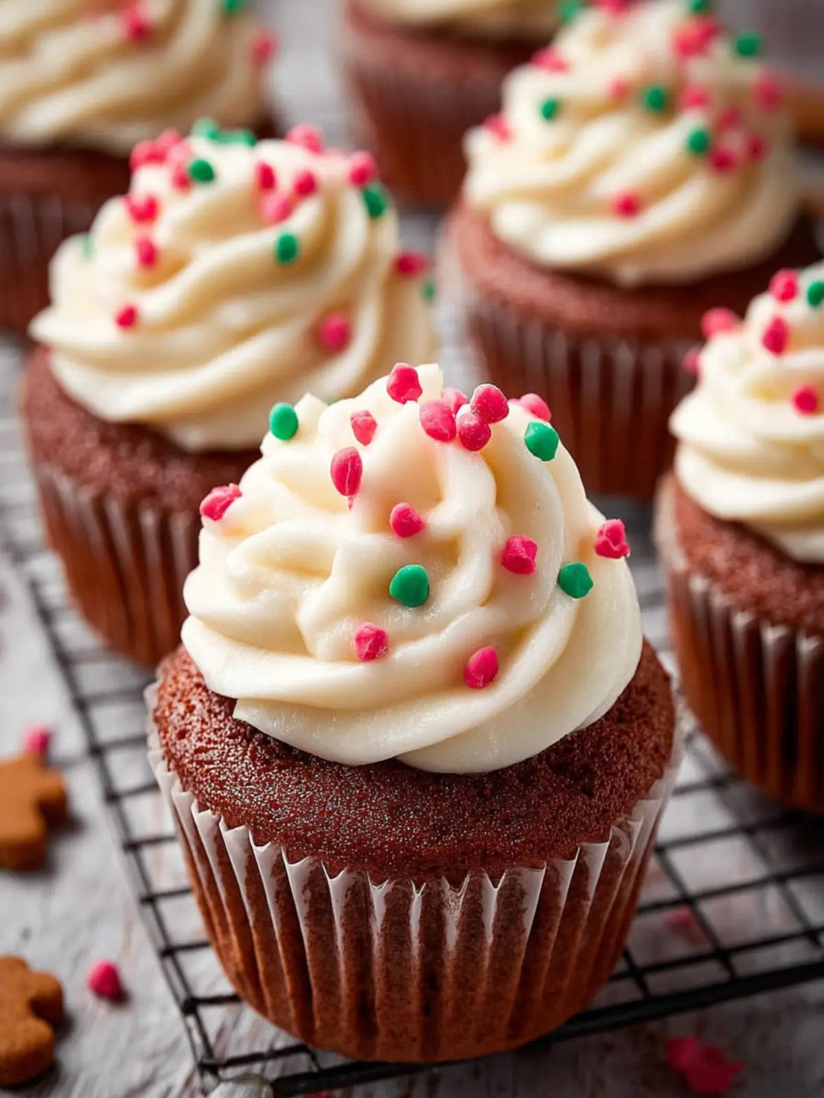 Deliciously spiced gingerbread cupcakes topped with a creamy frosting, perfect for the holiday season.