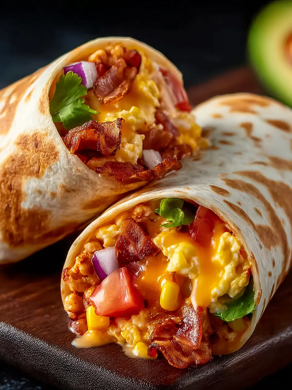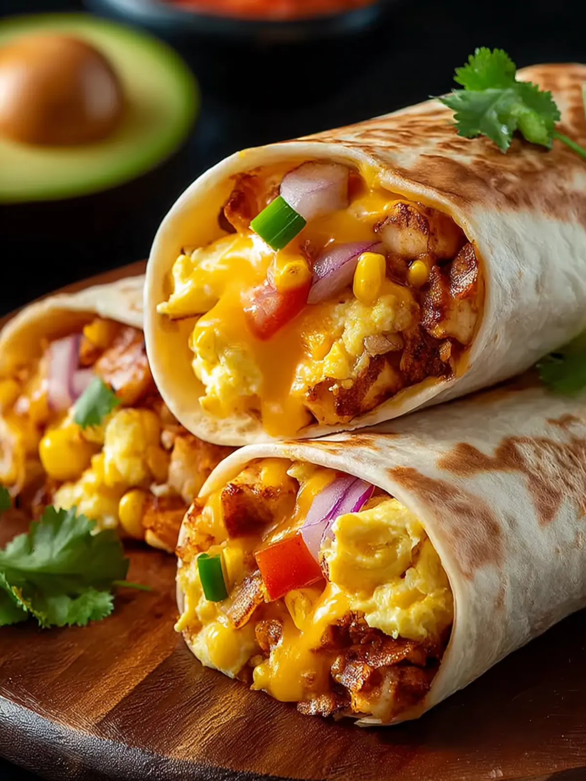 - Lay a tortilla flat, add a generous portion of the egg mixture down the center, and sprinkle with cheese. Top with sliced avocado. Roll the tortilla tightly to enclose the filling.
