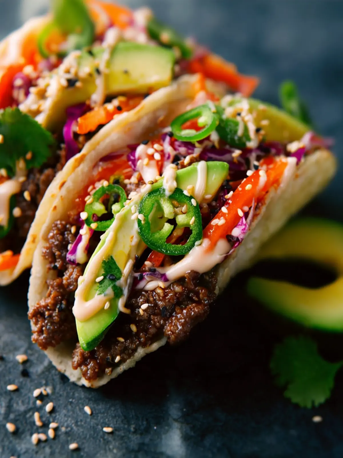 Delicious Asian-inspired flank steak tacos topped with crunchy slaw and a flavorful sauce.