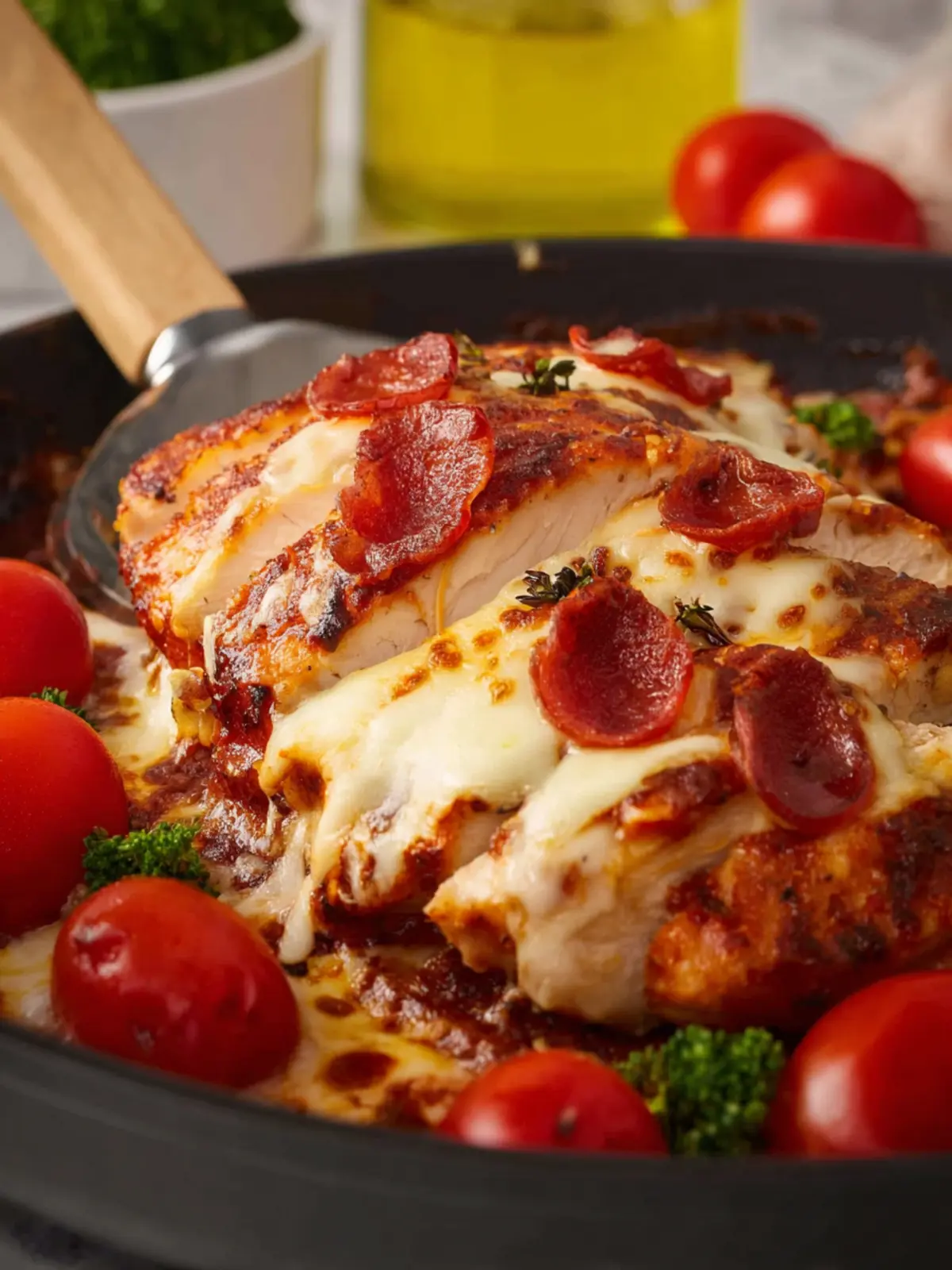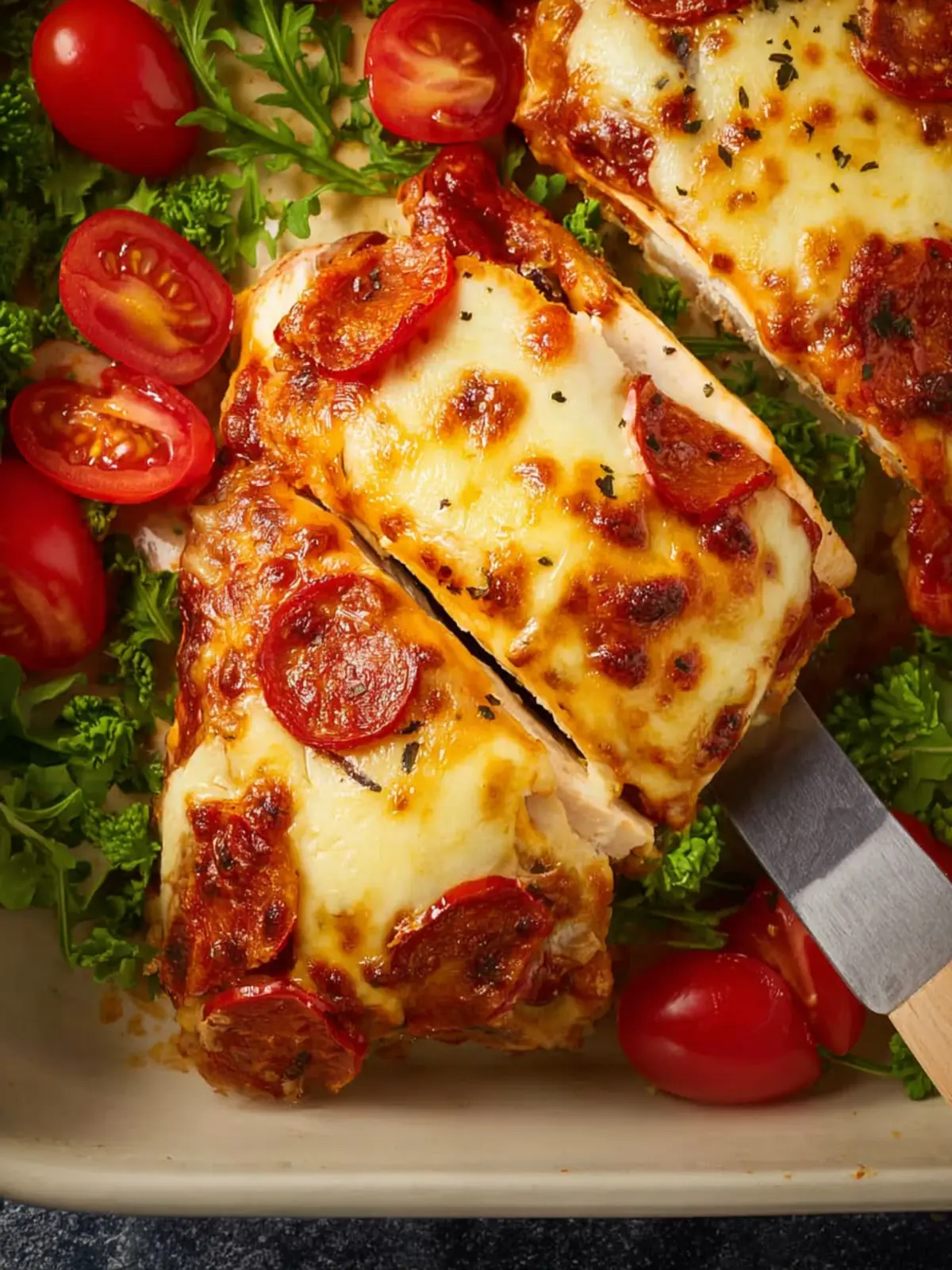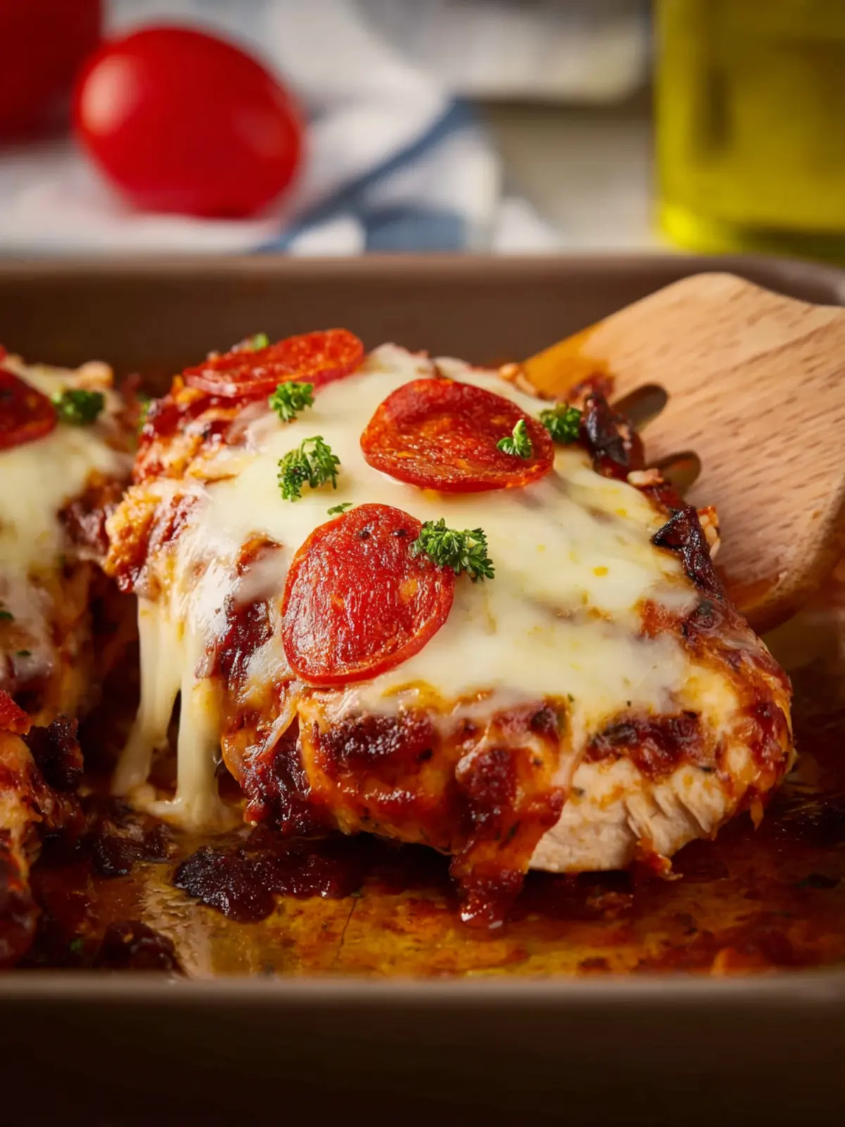 A delicious baked chicken recipe topped with tomato sauce, mozzarella cheese, and pepperonis.
