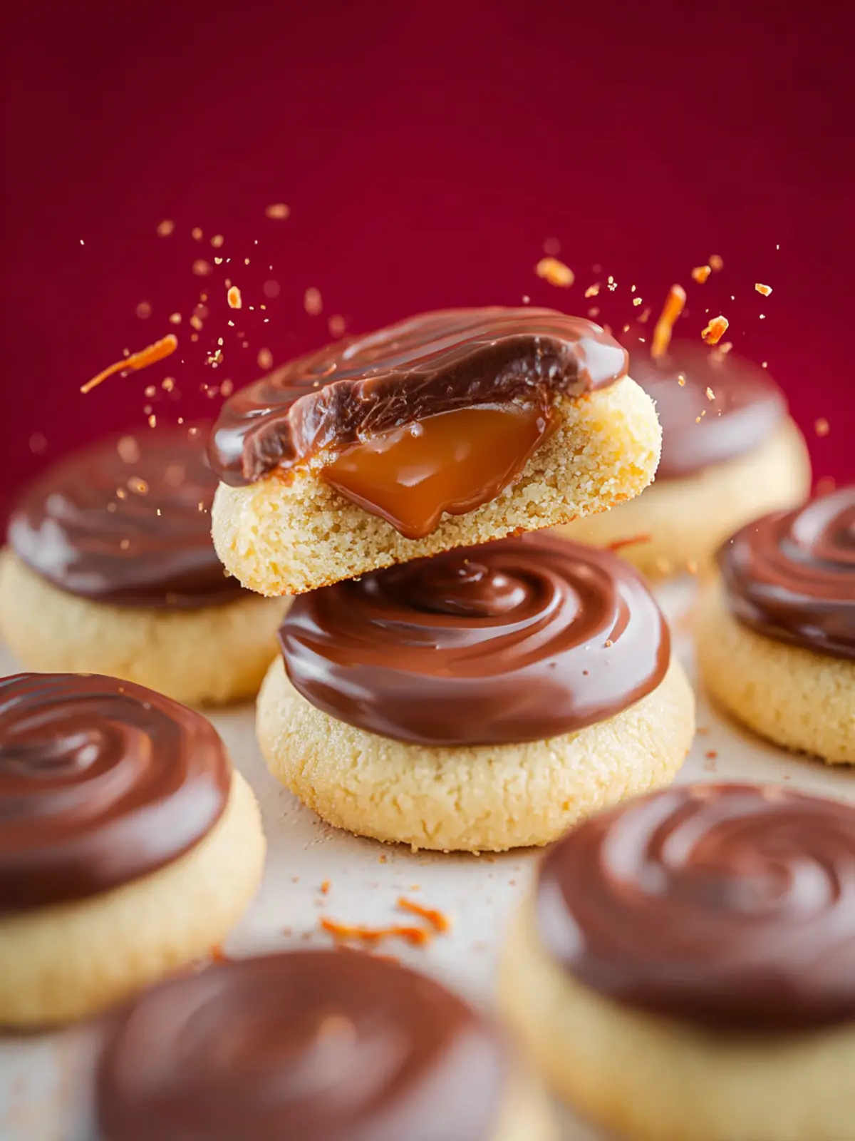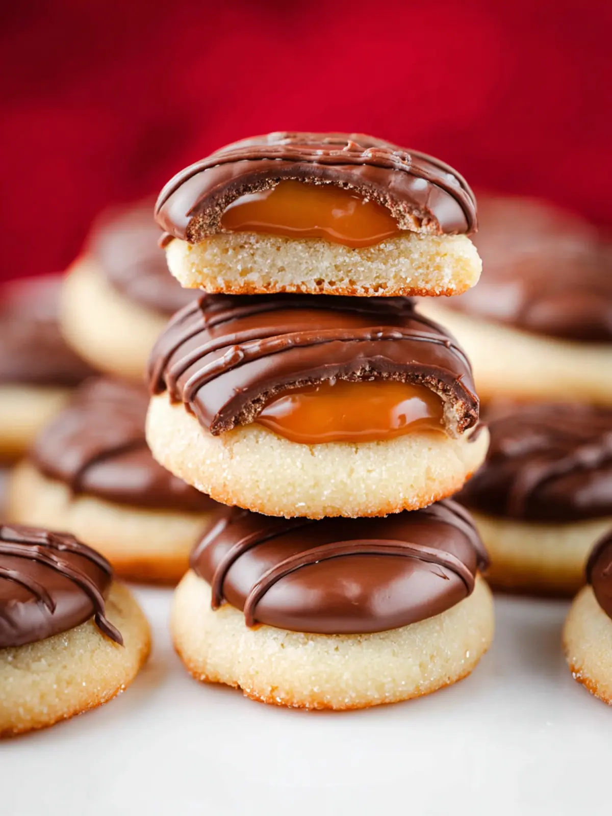 Delicious cookies filled with caramel and topped with melted milk chocolate.