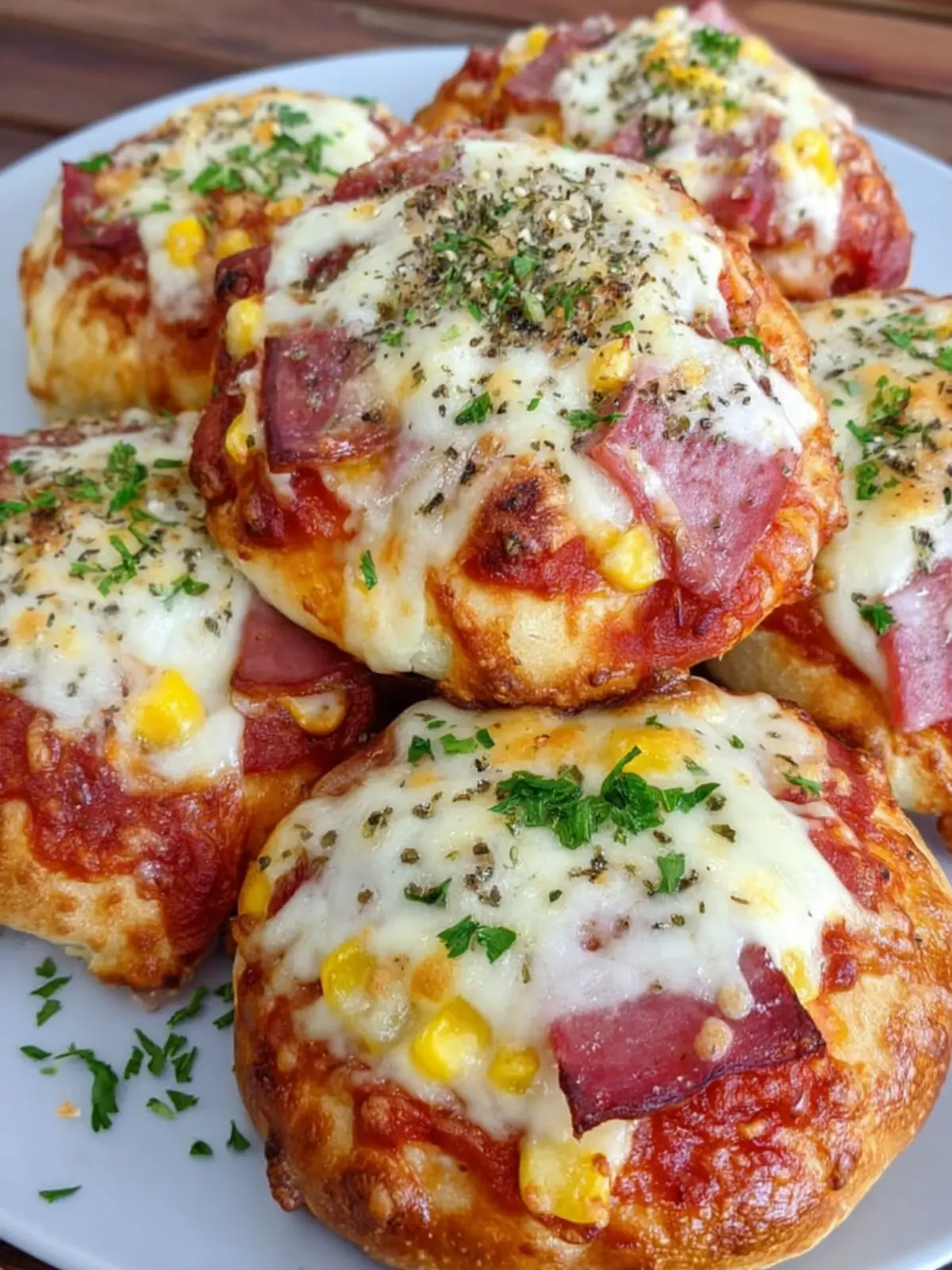 Delicious mini pizzas topped with ham, cheese, and a hint of herbs, perfect for appetizers or snacks.