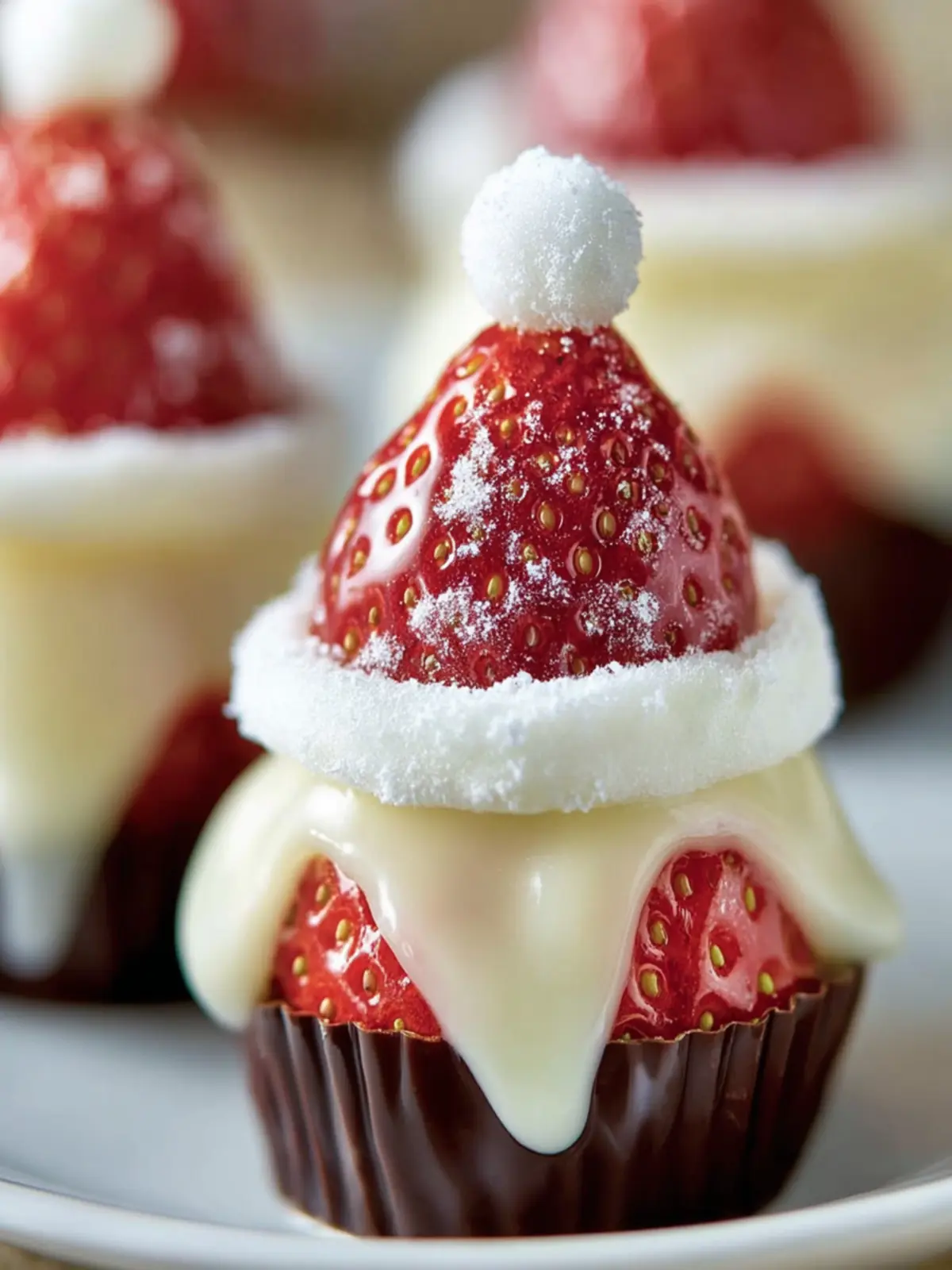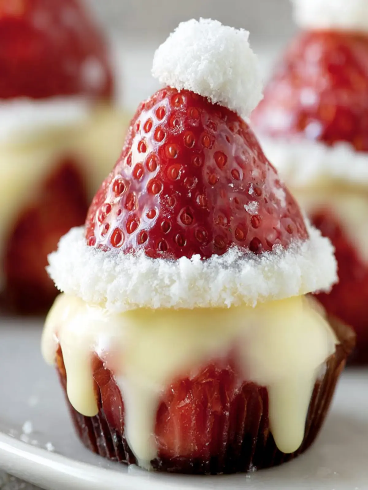 Delicious strawberry treats resembling Santa hats, perfect for holiday celebrations.