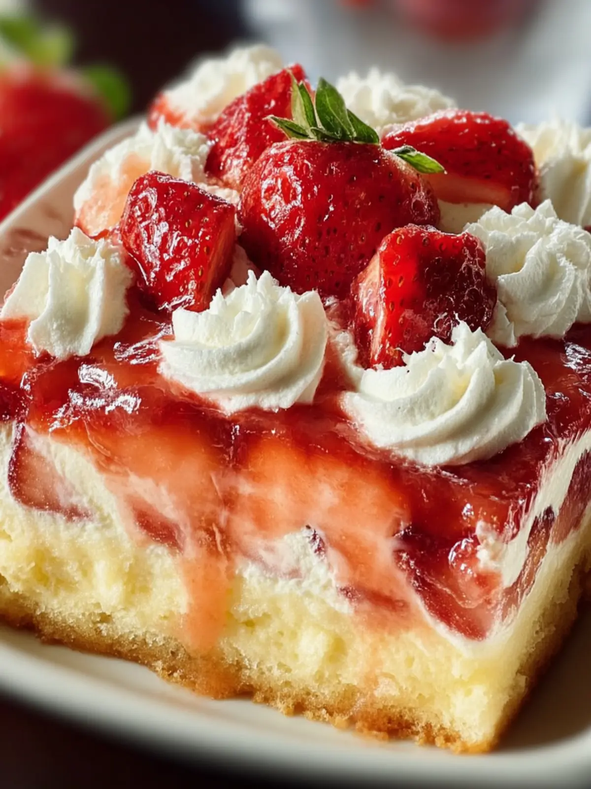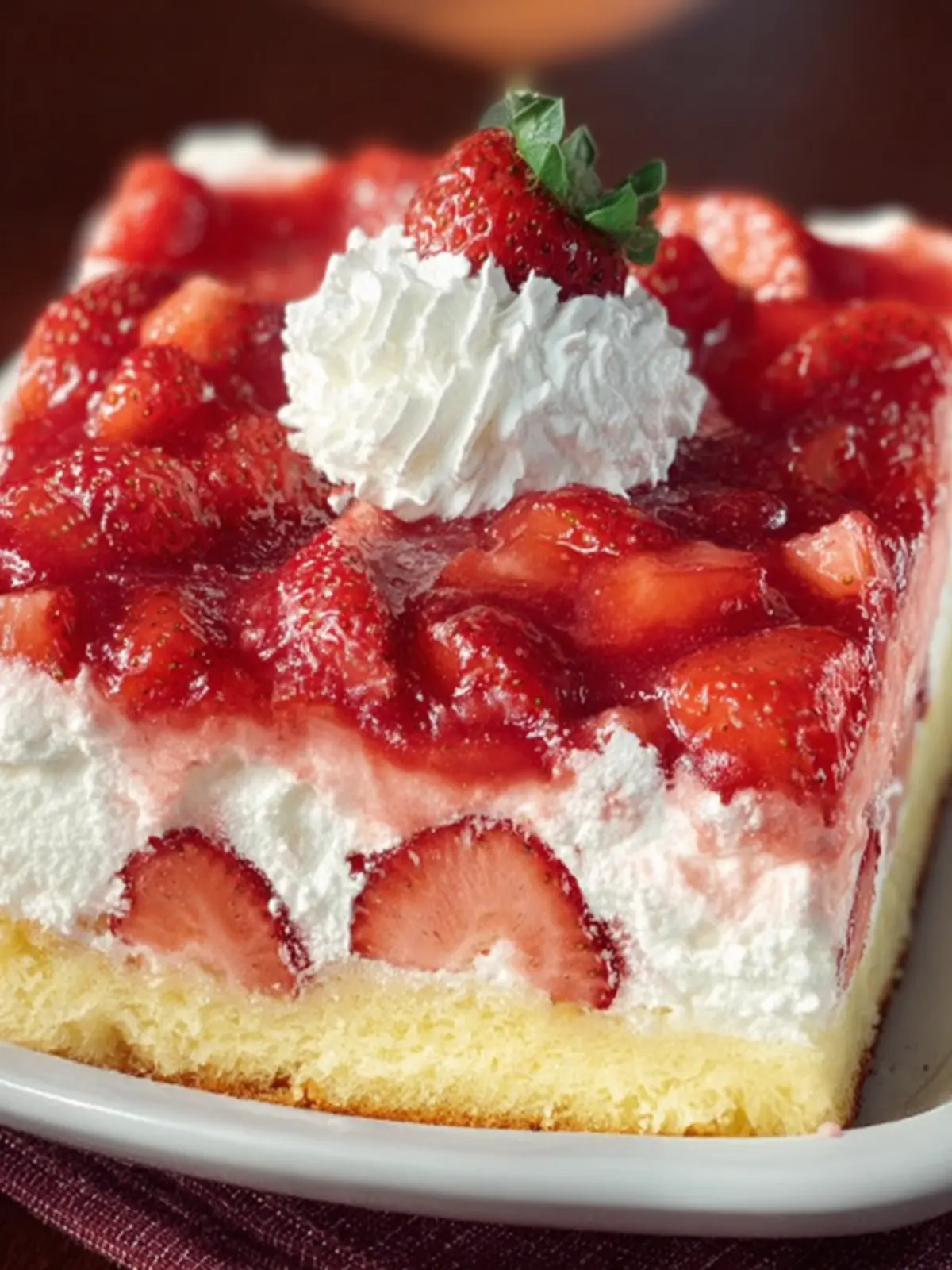 - Assemble the Dessert: Once the cake has cooled, poke holes all over with a fork. Pour the cooled gelatin mixture evenly over the cake. Spread the strawberry mixture over the top. Evenly spread the whipped cream over the strawberry mixture. Refrigerate for at least 2-3 hours, allowing the flavors to meld together.