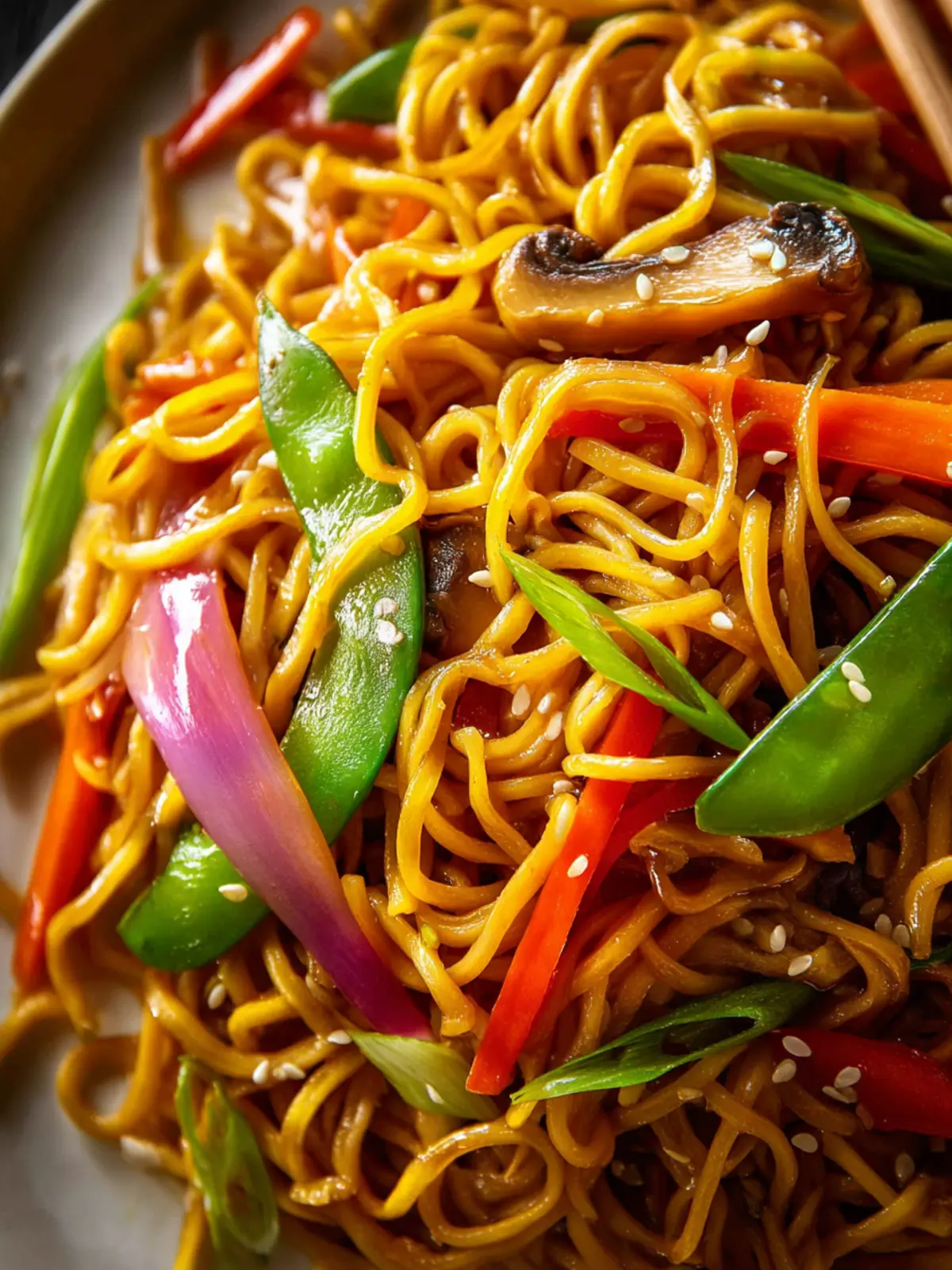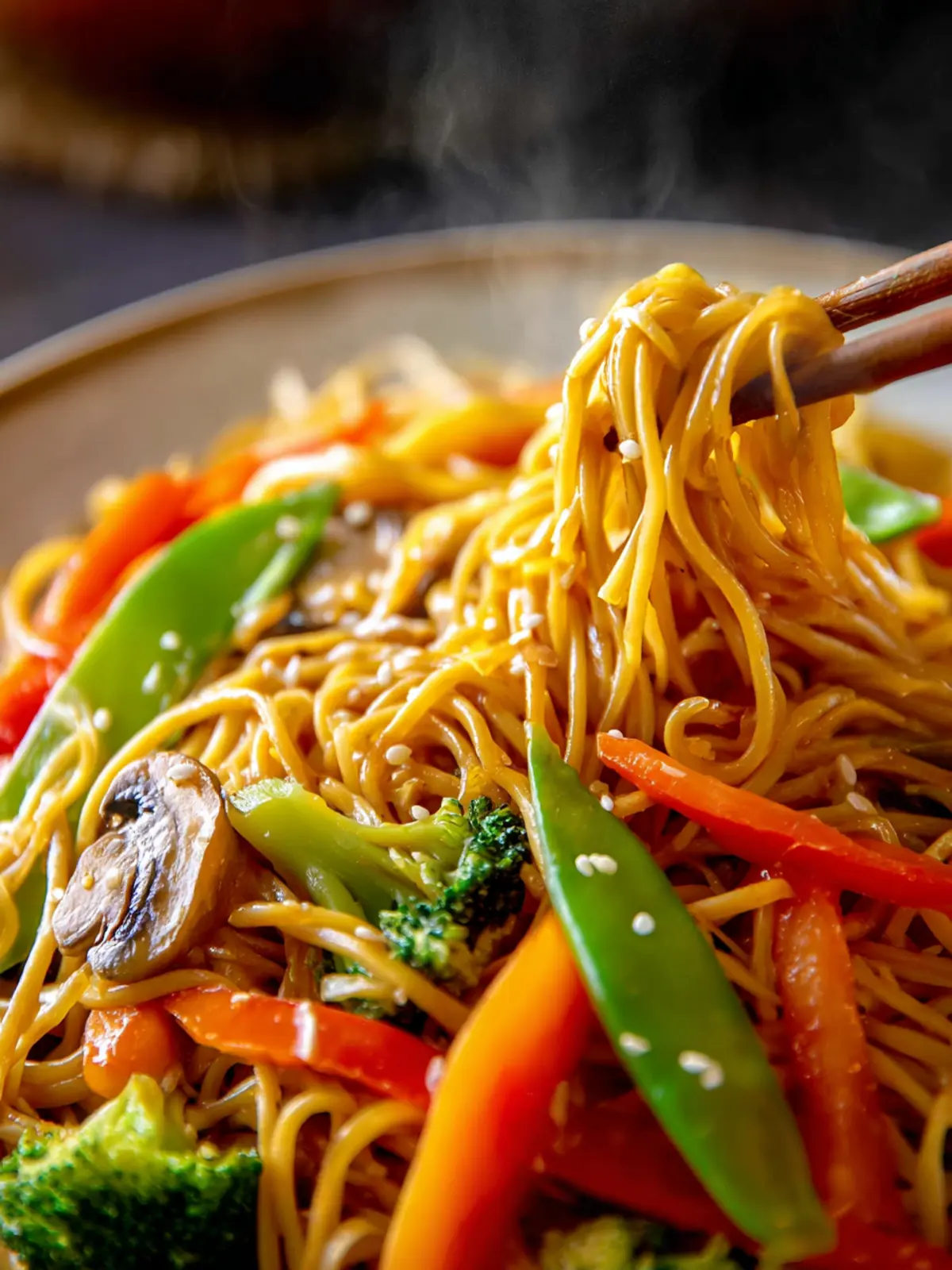 Imagine twirling your fork around tender, chewy noodles and a rainbow of fresh vegetables — bell peppers, carrots, snow peas, and green onions — all glistening under a savory sauce. Every ingredient plays its part, contributing to a harmonious blend of textures and flavors that make it truly satisfying.